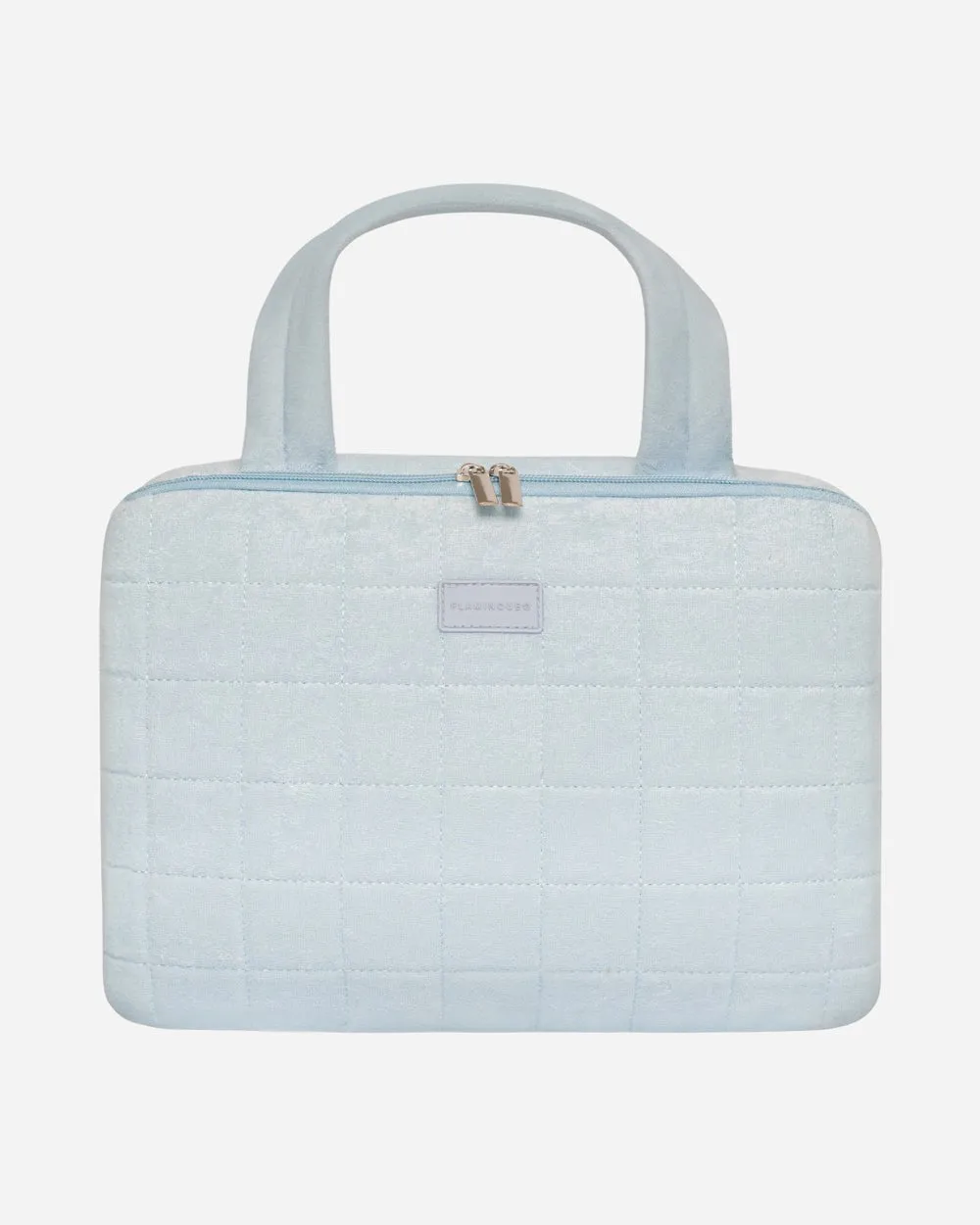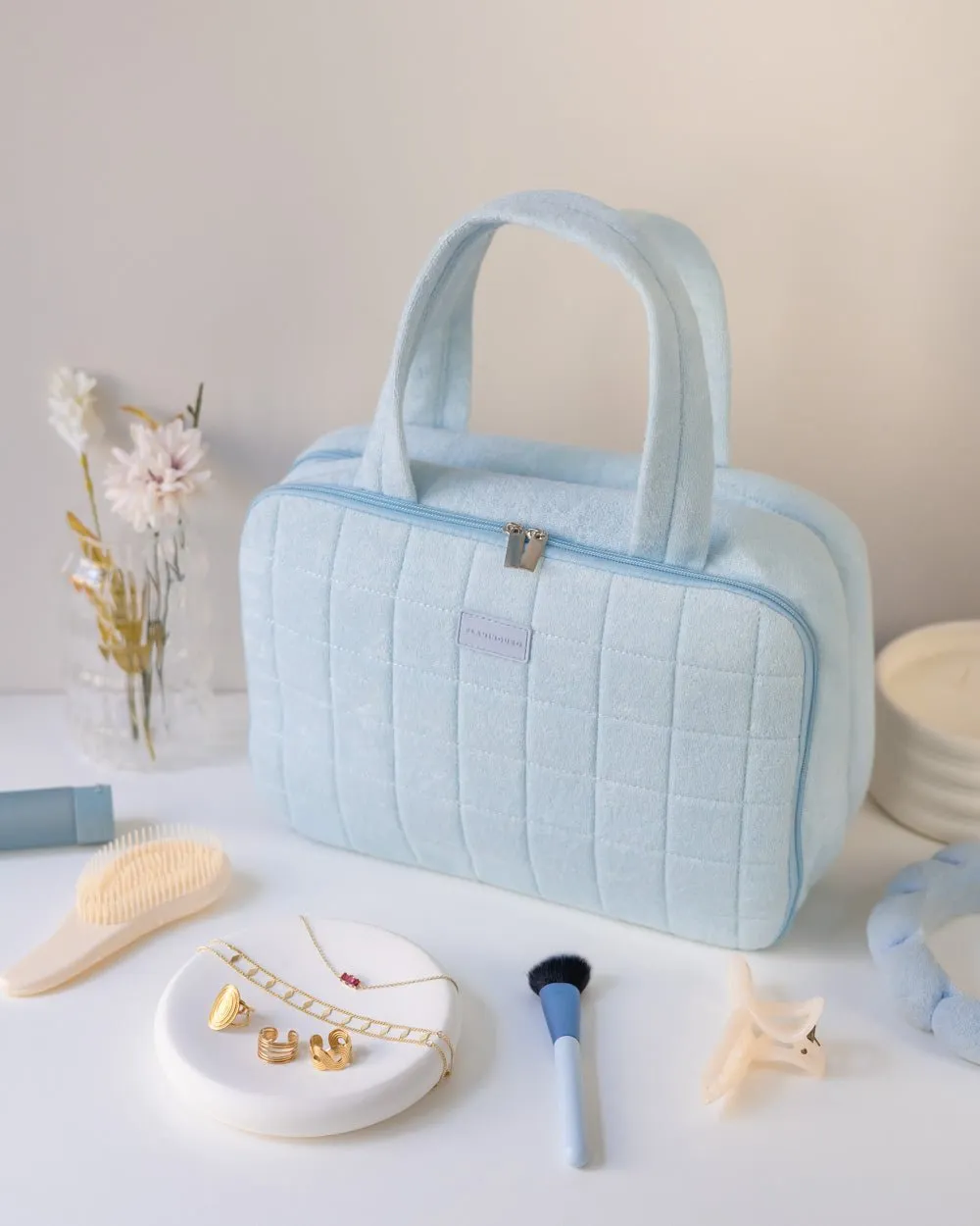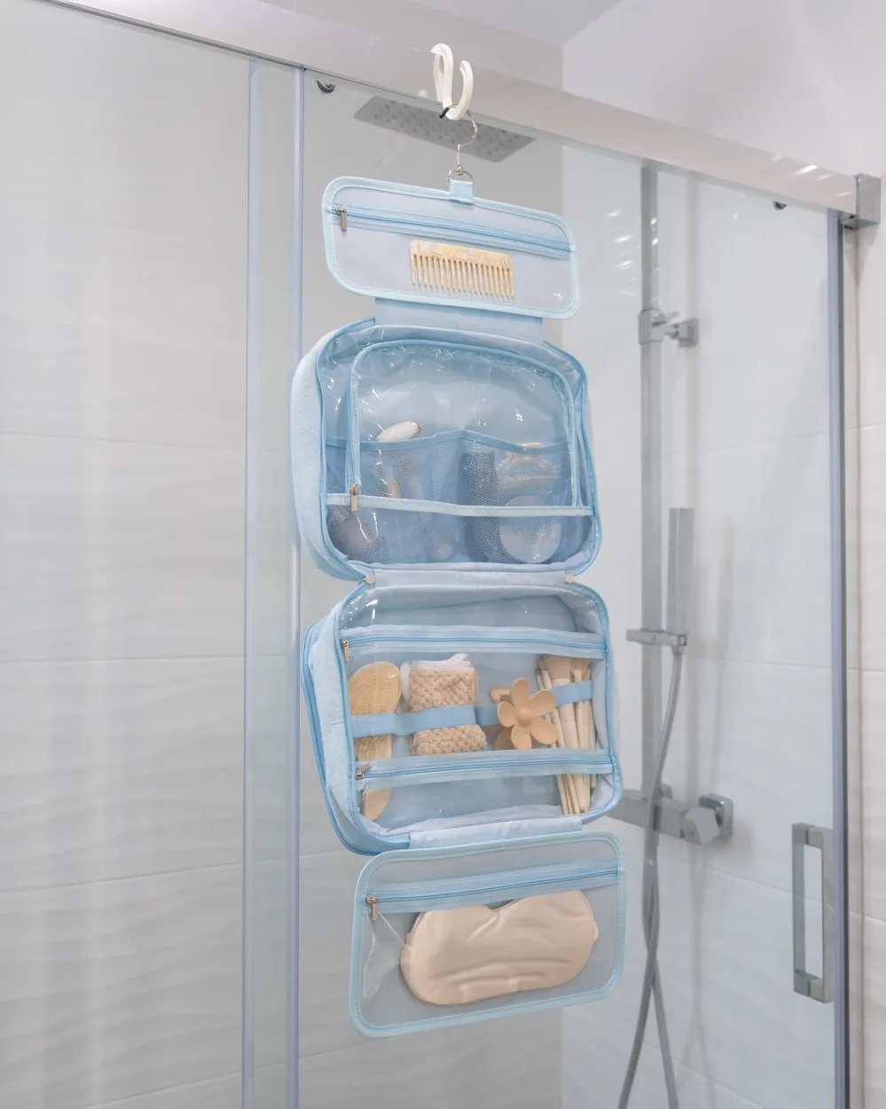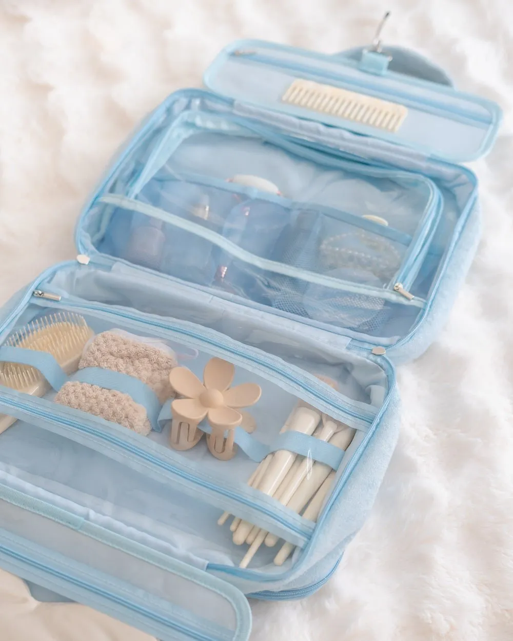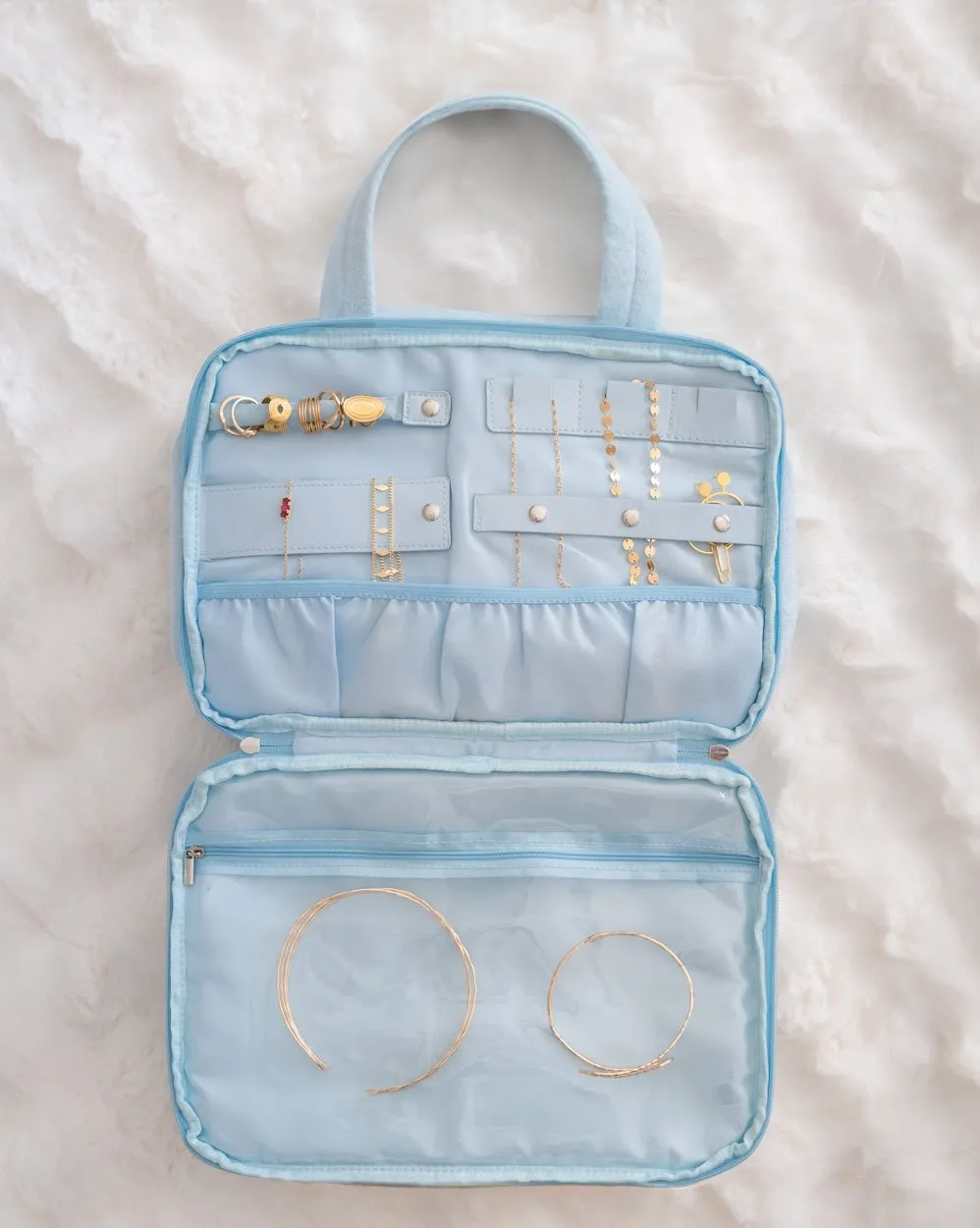 Neceser grande plegable color azul super suave. Cuenta con varios compartimentos interiores para mantener tu maquillaje o tus joyitas siempre organizadas. ¡Ideal para llevar tus básicos de beauty protegidos siempre que salgas de viaje!