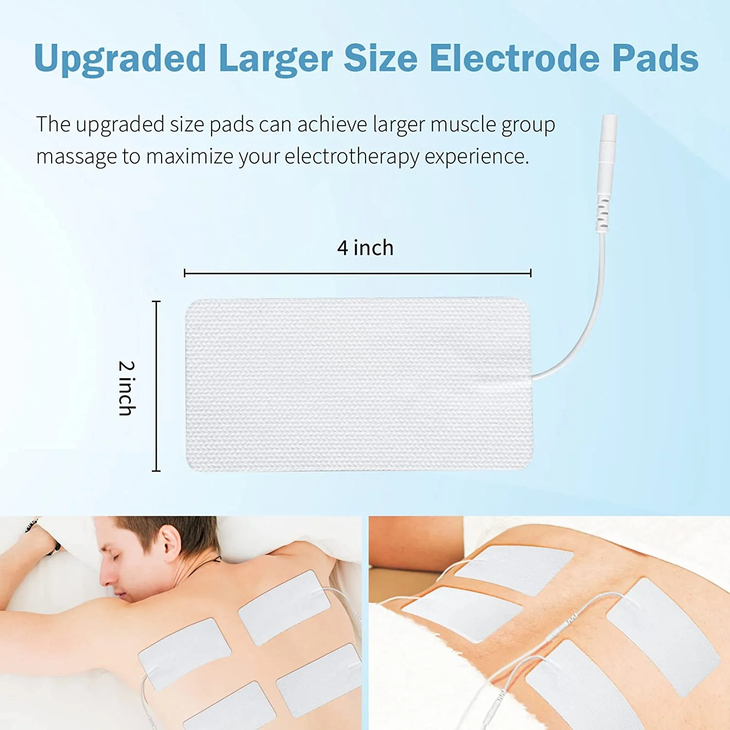 - El paquete incluye: 4 almohadillas de electrodos rectangulares grandes de 2 x 4 pulgadas, son reutilizables y diseñadas para distribuir uniformemente la corriente TENS