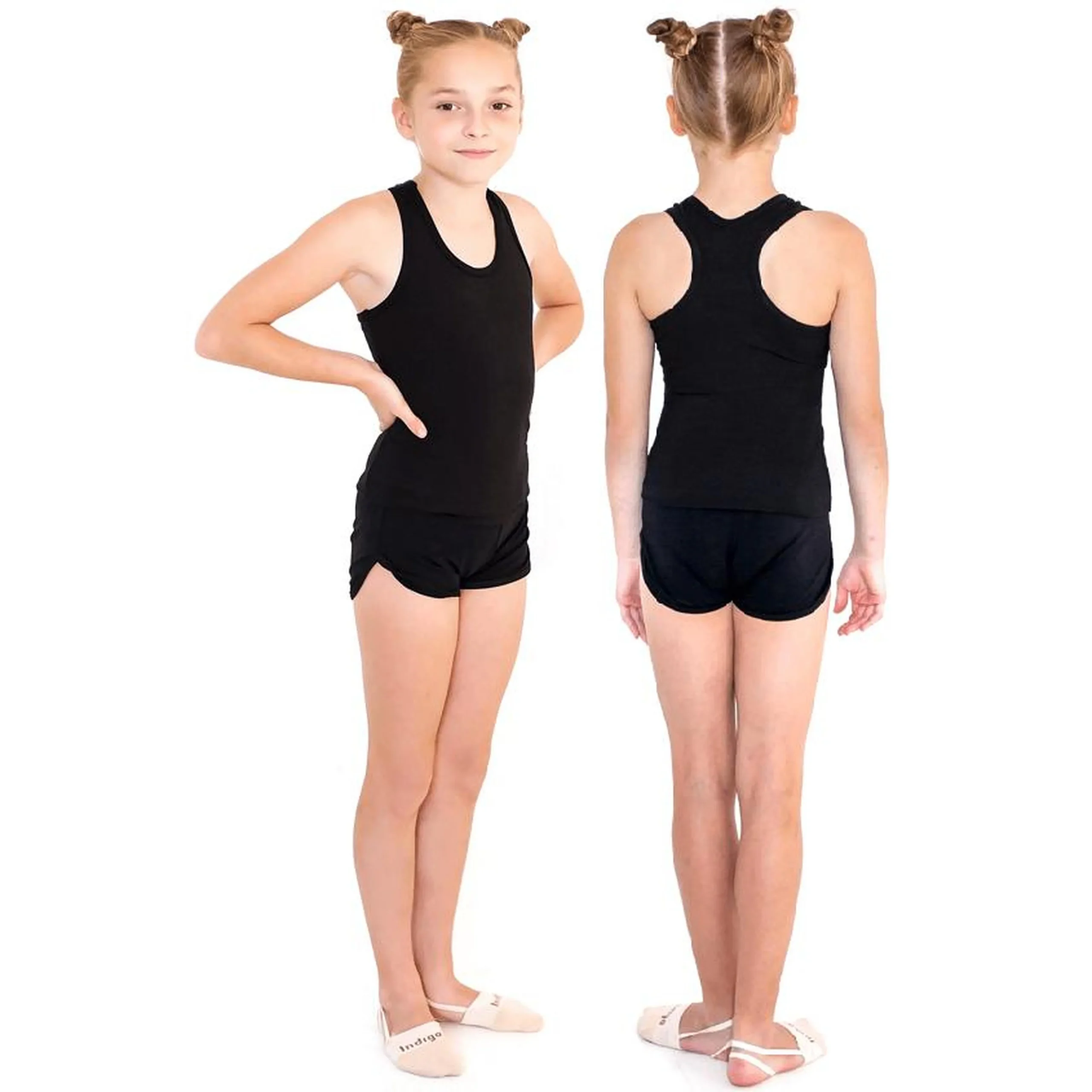 El short de gimnasia para niñas con ribete INDIGO es ideal para gimnasia y baile, se estira perfectamente, no restringe los movimientos y se asienta perfectamente sobre la figura.