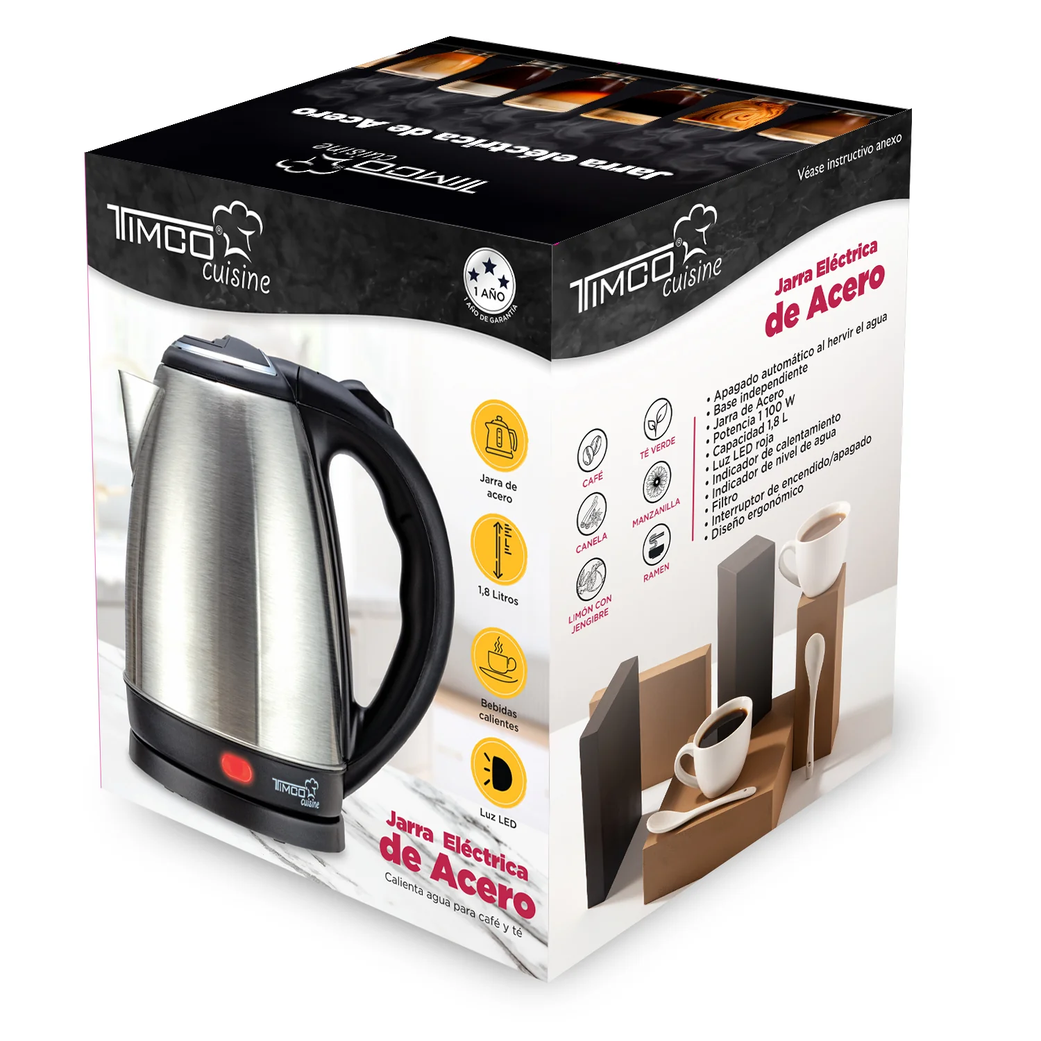 ¡Consigue agua hirviendo de forma segura y en segundos! La jarra eléctrica TIMCO es el accesorio perfecto para tu cocina, combinando un diseño elegante con la máxima eficiencia. Olvídate de esperar y disfruta de tus bebidas favoritas cuando quieras.